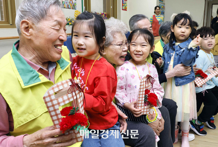 어버이날을 하루 앞둔 지난 5월 7일 오전 경기 수원시 팔달구 팔달노인복지관에서 관내 어린이집 아이들이 어르신들에게 카네이션을 달아드리고 있다. 본 기사와 직접 관련 없음 [김호영 기자] 우리나라 국민은 평균 28세 때 인생 흑자 시기에 진입해 43세에 최대 흑자를 기록하며 61세에 적자 전환하는 것으로 나타났다.