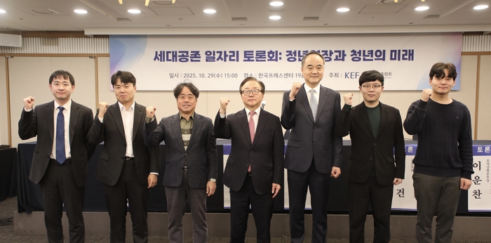 변재현 미래생각일자리센터장,송시영 새로고침노동자협의회 비상대책위원장,권순원 숙명여대 교수,이동근 경총 상근부회장,김대일 서울대 교수,김건 신전국대학생대표자협의회 공동의장,이운찬 시국에행동하는대학연합 조직강화본부장(왼쪽부터)가 29일 서울 중구 프레스센터에서 열린 일자리 토론회에 앞서 포즈를 취하고 있다. 한국경영자총협회