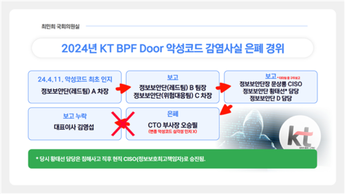 [뉴스1] KT가 지난해 개인정보를 보관해 두는 서버가 악성코드인 BPF도어에 감염된 정황을 파악하고도 은폐했다는 지적이 나왔다. 보안·기술 관련 C레벨 임원들이 통신당국은 물론 대표이사에게도 보고하지 않고 자체적으로 수습한 정황이 드러났다.