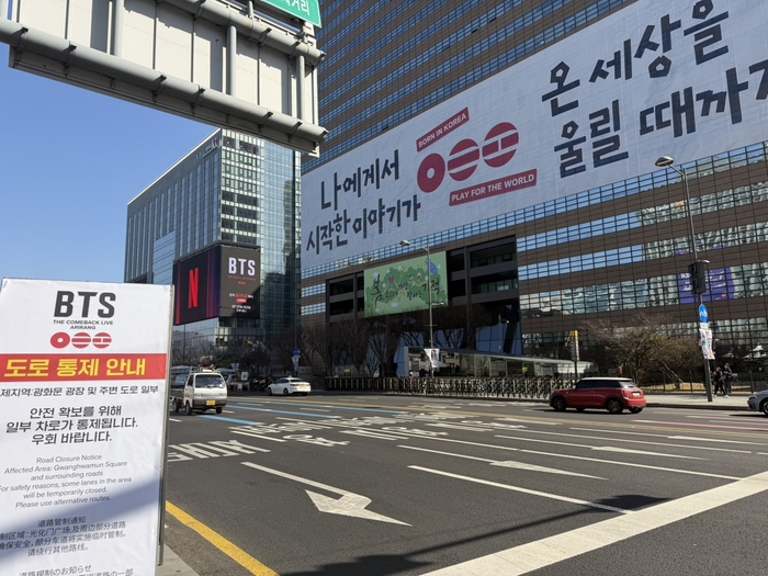 오는 21일 BTS 컴백 공연을 앞두고 설치된 광화문 도로 통제 안내판/사진=문서연 여행+ 기자 20일 법무부 출입국·외국인정책본부에 따르면 지난 1일부터 18일까지 국내에 입국한 외국인(승무원 제외)은 109만 9700명이다. 지난해 같은 기간(82만 8500명)보다 32.7% 증가한 수치다.