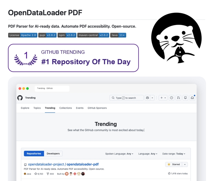 오픈데이터로더 PDF v2.0은 지난 21일 하루에만 깃허브 인기 지표인 ‘스타’를 1800개 이상 획득했으며,총 스타 수 7000개를 돌파하며 글로벌 개발자 커뮤니티의 관심을 모았다.